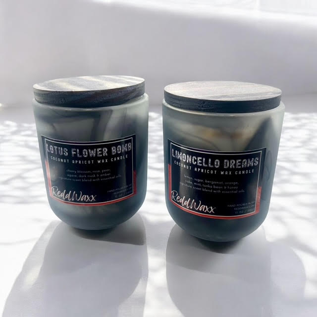 Elevate your space with the ReddWaxx Marble Luxe Candle Collection. Hand-poured coconut apricot wax in two signature scents burns clean and long, enhanced by stunning wax embeds. Each frosted glass jar features unique black swirls, reminiscent of smoke wisps, blending beauty and aromatherapy into every moment.